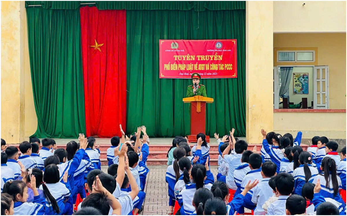 Công an xã Đại Huệ tuyên truyền phổ biến pháp luật ATGT và kỹ năng PCCC trong trường học(congan.nghean.gov.vn)-Vừa qua, Công an xã Đại Huệ phối hợp với Trường Tiểu học Nam Anh tổ chức tuyên truyền, phổ biến pháp luật cho toàn thể cán bộ, giáo viên và học sinh nhà trường về an toàn giao thông (ATGT), phòng cháy chữa cháy (PCCC) và hướng dẫn kỹ năng thoát hiểm khi xảy ra sự cố cháy nổ.
