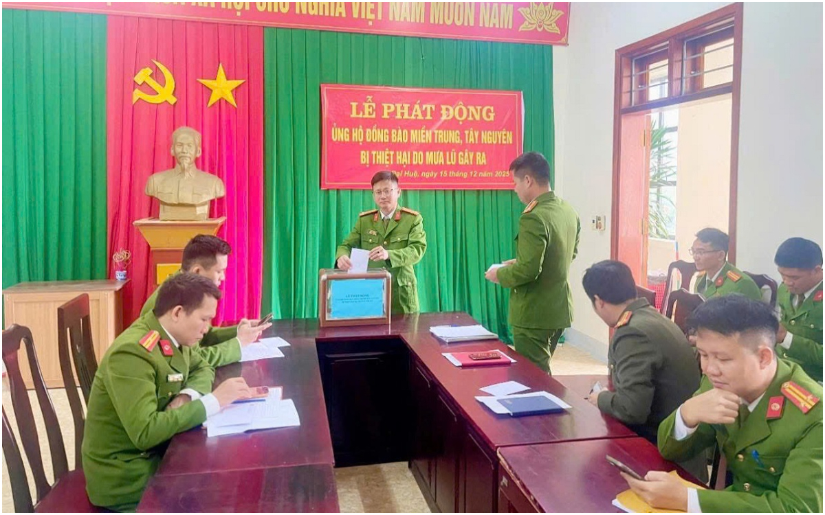 Công an xã Đại Huệ chung tay ủng hộ đồng bào miền Trung, Tây Nguyên bị thiệt hại do thiên tai(congan.nghean.gov.vn)-Hưởng ứng lời kêu gọi của Bộ trưởng Bộ Công an, Giám đốc Công an tỉnh, sáng 15/12/2025, Công an xã Đại Huệ tổ chức Lễ phát động ủng hộ đồng bào miền Trung, Tây Nguyên bị thiệt hại do mưa lũ gây ra.