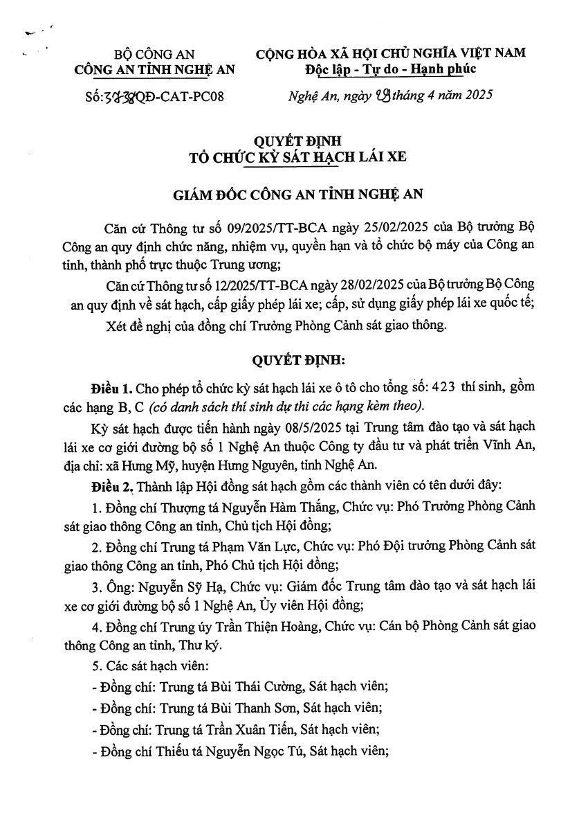 (Congan.nghean.gov.vn)-Công an Nghệ An thông báo tổ chức kỳ sát hạch lái xe ngày 8/5/2025, tại Trung tâm đào tạo và sát hạch lái xe cơ giới đường bộ số 1 Nghệ An thuộc Công ty đầu tư và phát triển Vĩnh An. Địa chỉ: xã Hưng Mỹ, huyện Hưng Nguyên, tỉnh Nghệ An.