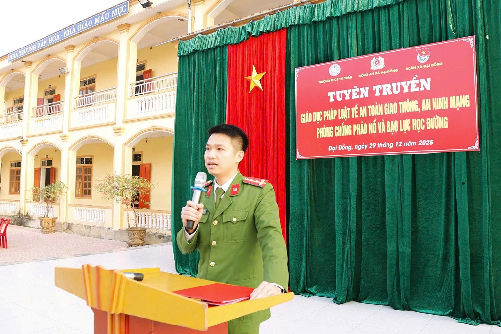 (Congan.nghean.gov.vn)-Vừa qua, Công an xã Đại Đồng tổ chức tuyên truyền, phổ biến pháp luật tại Trường THCS Thị trấn Đại Đồng với nội dung thiết thực: giáo dục pháo luật về an toàn giao thông, an ninh mạng, phòng chống pháo nổ và bạo lực học đường.