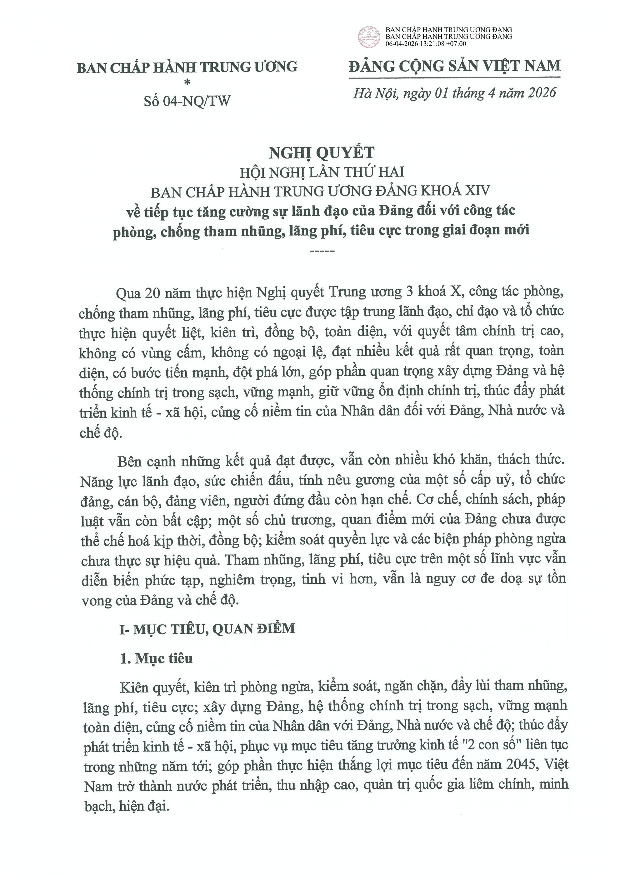 Thay mặt Ban Chấp hành Trung ương Đảng, Tổng Bí thư Tô Lâm ký ban hành Nghị quyết số 04-NQ/TW Hội nghị lần thứ hai Ban Chấp hành Trung ương Đảng khóa XIV về tiếp tục tăng cường sự lãnh đạo của Đảng đối với công tác phòng, chống tham nhũng, lãng phí, tiêu cực trong giai đoạn mới.
