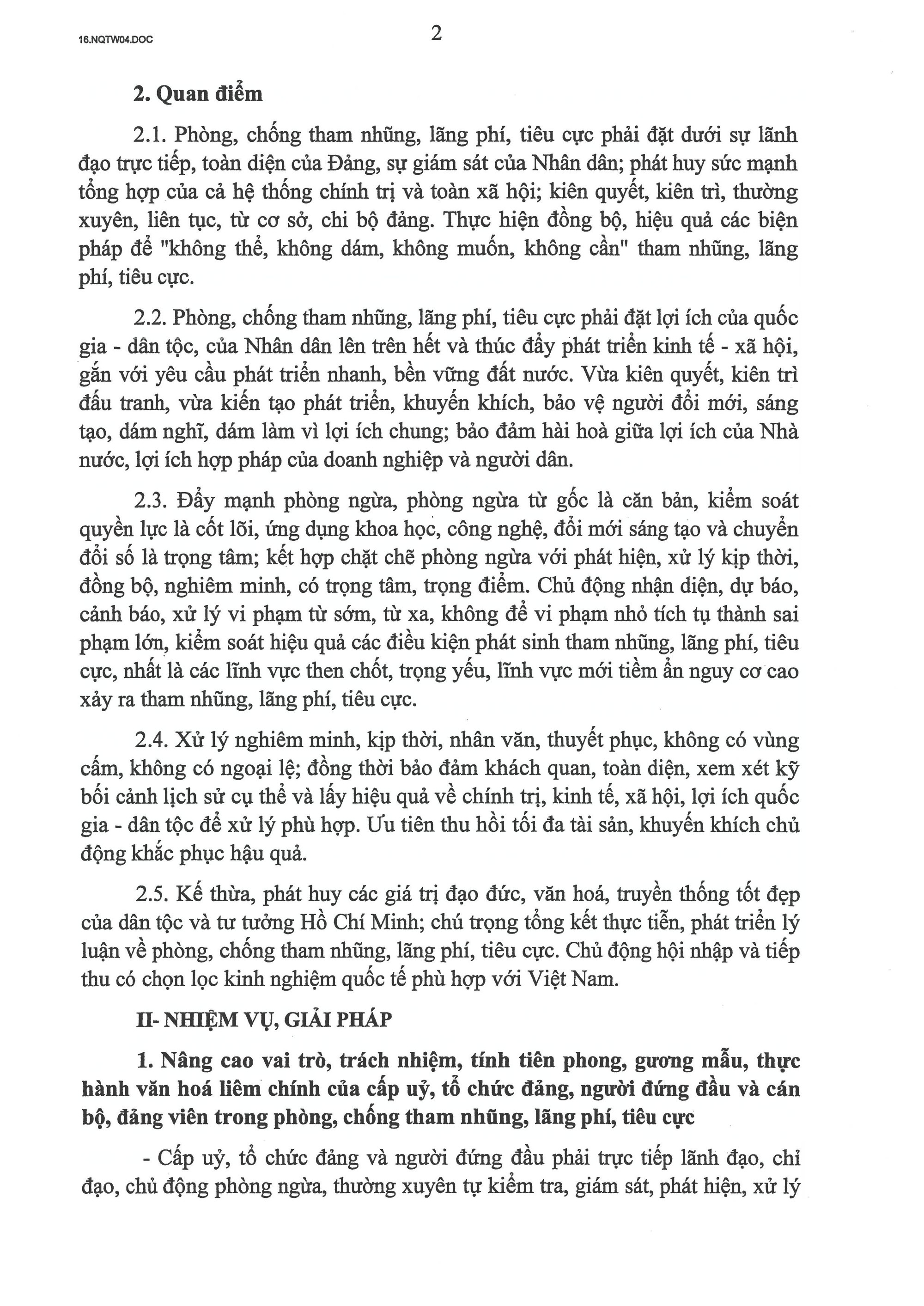 2.1. Phòng, chống tham nhũng, lãng phí, tiêu cực phải đặt dưới sự lãnh đạo trực tiếp, toàn diện của Đảng, sự giám sát của Nhân dân; phát huy sức mạnh tổng hợp của cả hệ thống chính trị và toàn xã hội; kiên quyết, kiên trì, thường xuyên, liên tục, từ cơ sở, chi bộ đảng. Thực hiện đồng bộ, hiệu quả các biện pháp để "không thể, không dám, không muốn, không cần" tham nhũng, lãng phí, tiêu cực.