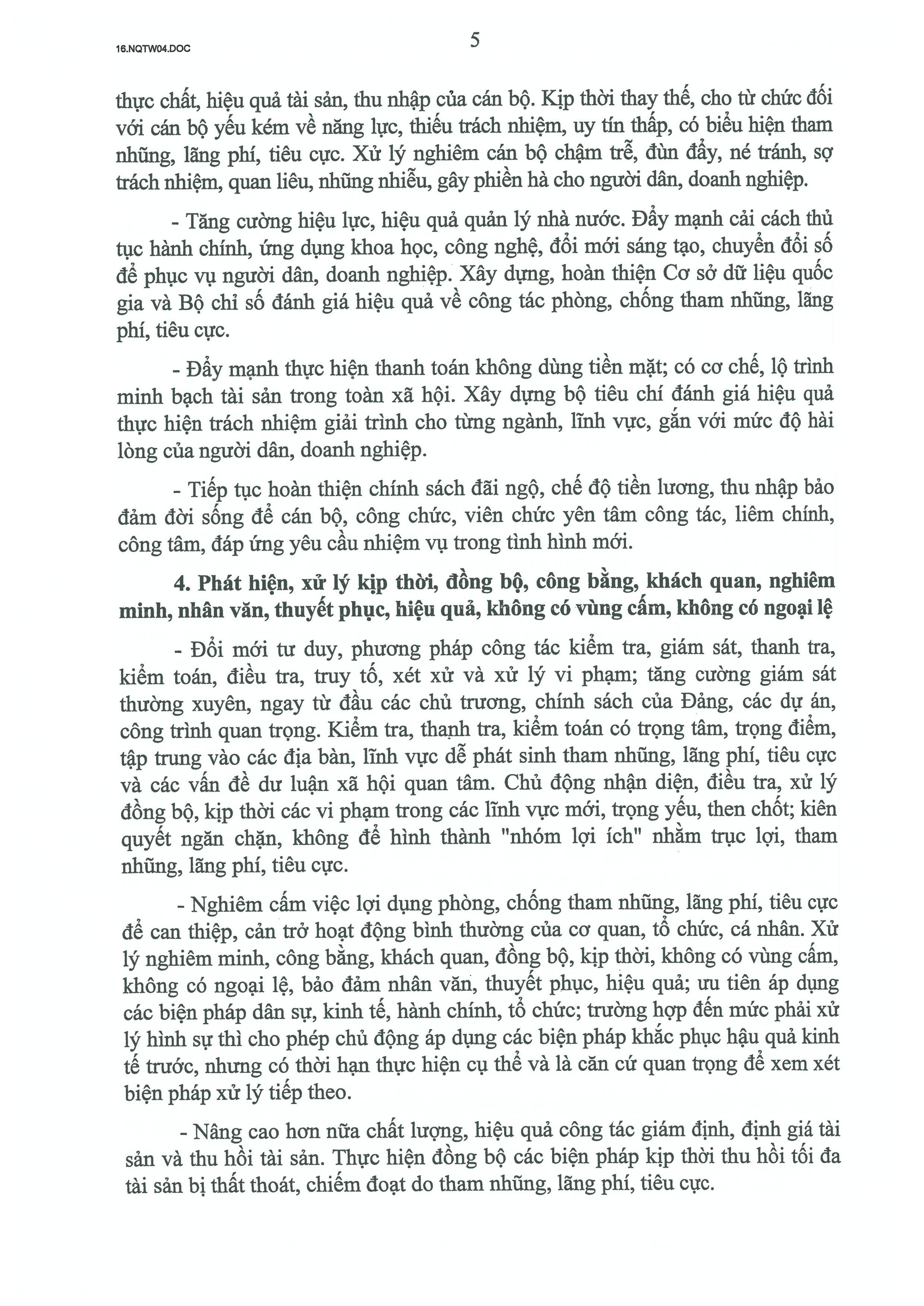5. Đảng uỷ Mặt trận Tổ quốc, các đoàn thể Trung ương tiếp tục lãnh đạo, chỉ đạo hoàn thiện cơ chế để Nhân dân tích cực tham gia phòng, chống tham nhũng, lãng phí, tiêu cực.
