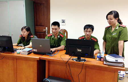 Cán bộ, chiến sỹ Phòng 2 Văn phòng Interpol lên mạng đấu tranh với tội phạm sử dụng công nghệ cao. |