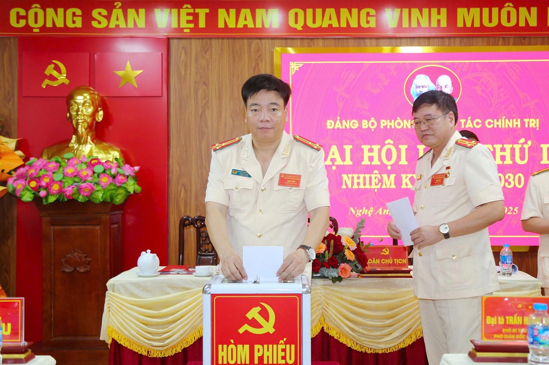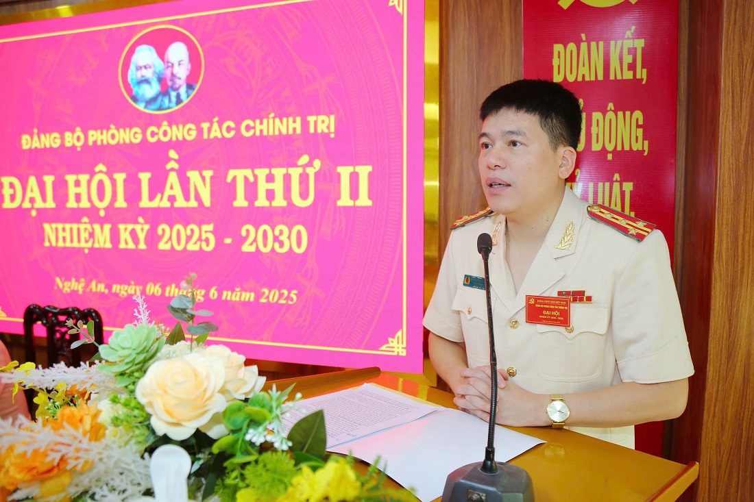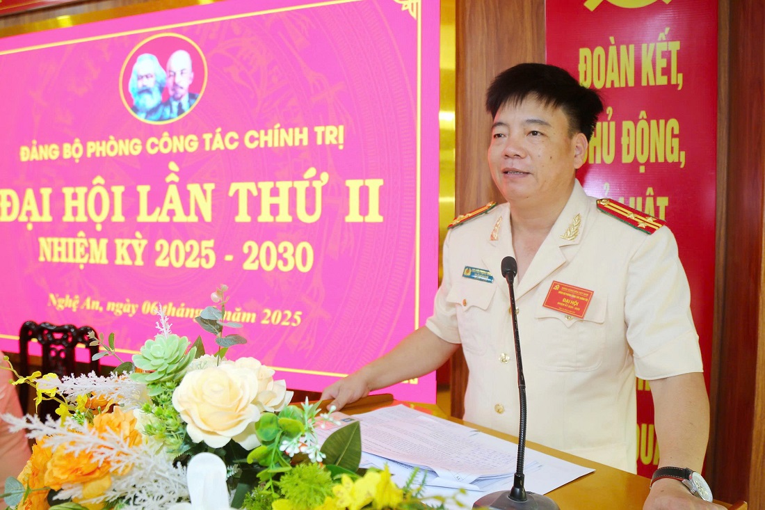 Phát biểu chỉ đạo tại Đại hội, đồng chí Đại tá Trần Hồng Quang, Phó Bí thư Đảng ủy, Phó Giám đốc Công an tỉnh ghi nhận và biểu dương những thành tích nổi bật của Đảng bộ Phòng Công tác chính trị trong nhiệm kỳ qua. Bước vào nhiệm kỳ 2025 - 2030, trước yêu cầu nhiệm vụ công tác ngày càng cao, đồng chí Phó Giám đốc đề nghị Đảng bộ tiếp tục đề ra các chủ trương, giải pháp cả về chính trị, tư tưởng, tổ chức và đạo đức nhằm không ngừng đổi mới, nâng cao năng lực lãnh đạo, sức chiến đấu của tổ chức Đảng, quyết tâm hoàn thành xuất sắc nhiệm vụ được giao; phát huy vai trò tiên phong, gương mẫu của đảng viên, cán bộ, đặc biệt là người đứng đầu. Làm tốt công tác tham mưu, tổ chức hiệu quả các hoạt động tuyên truyền, giáo dục chính trị tư tưởng, văn hóa - văn nghệ, thi đua - khen thưởng, tạo tiền đề xây dựng lực lượng Công an Nghệ An chính quy, tinh nhuệ, hiện đại.