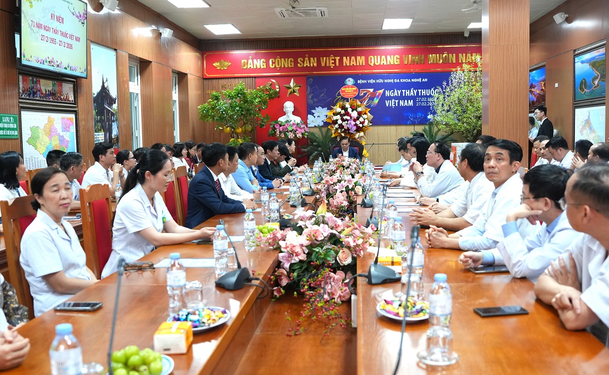 (Congan.nghean.gov.vn)-Chiều 24/02/2026, nhân kỷ niệm 71 năm Ngày Thầy thuốc Việt Nam (27/02/1955 - 27/02/2026), đồng chí Võ Trọng Hải - Phó Bí thư Tỉnh ủy, Chủ tịch UBND tỉnh đến thăm, chúc mừng đội ngũ y, bác sĩ và người lao động tại Bệnh viện Hữu nghị Đa khoa Nghệ An, Bệnh viện Công an tỉnh Nghệ An và Bệnh viện Mắt Sài Gòn - Vinh.