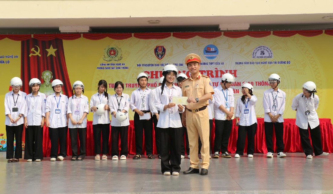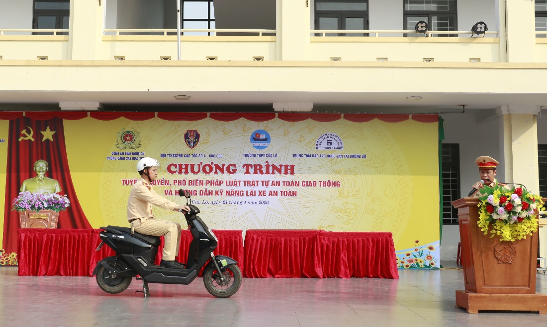 (Congan.nghean.gov.vn)-Sáng 21/4/2026, Phòng Cảnh sát giao thông (CSGT) Công an tỉnh phối hợp Đội Tuần tra kiểm soát giao thông đường bộ cao tốc số 4 - Cục CSGT, Trường THPT Cửa Lò và Trung tâm Đào tạo nghề vận tải đường bộ tổ chức Chương trình tuyên truyền, phổ biến pháp luật về trật tự an toàn giao thông và hướng dẫn kỹ năng lái xe an toàn cho học sinh.