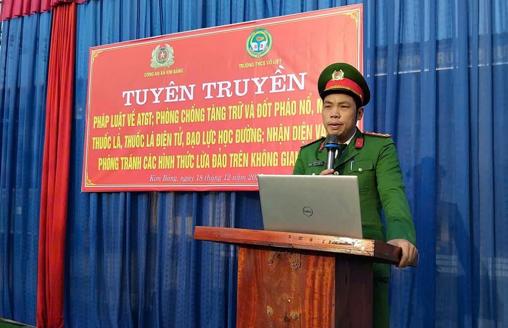 (Congan.nghean.gov.vn)-Sáng 18/12/2025, Công an xã Kim Bảng, tỉnh Nghệ An tổ chức buổi tuyên truyền, phổ biến giáo dục pháp luật cho cán bộ, giáo viên và hơn 400 học sinh Trường THCS Võ Liệt.