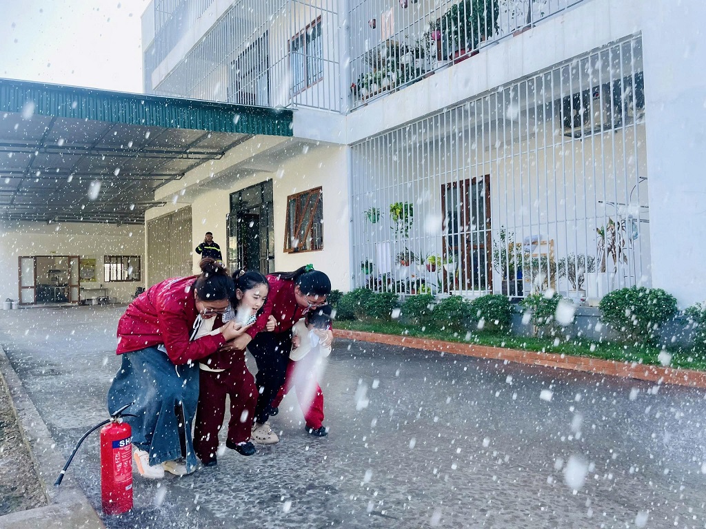 Điểm nhấn của buổi tuyên truyền là nội dung hướng dẫn kỹ năng thoát nạn trong môi trường có khói, khí độc và diễn tập phương án chữa cháy. Các em nhỏ được trực tiếp trải nghiệm cách cúi thấp người khi di chuyển, che mũi miệng bằng khăn ướt, lần theo lối thoát hiểm an toàn. Việc tổ chức cho trẻ thực hành ngay tại chỗ giúp dễ ghi nhớ, hình thành phản xạ tự bảo vệ bản thân trong tình huống nguy hiểm.
