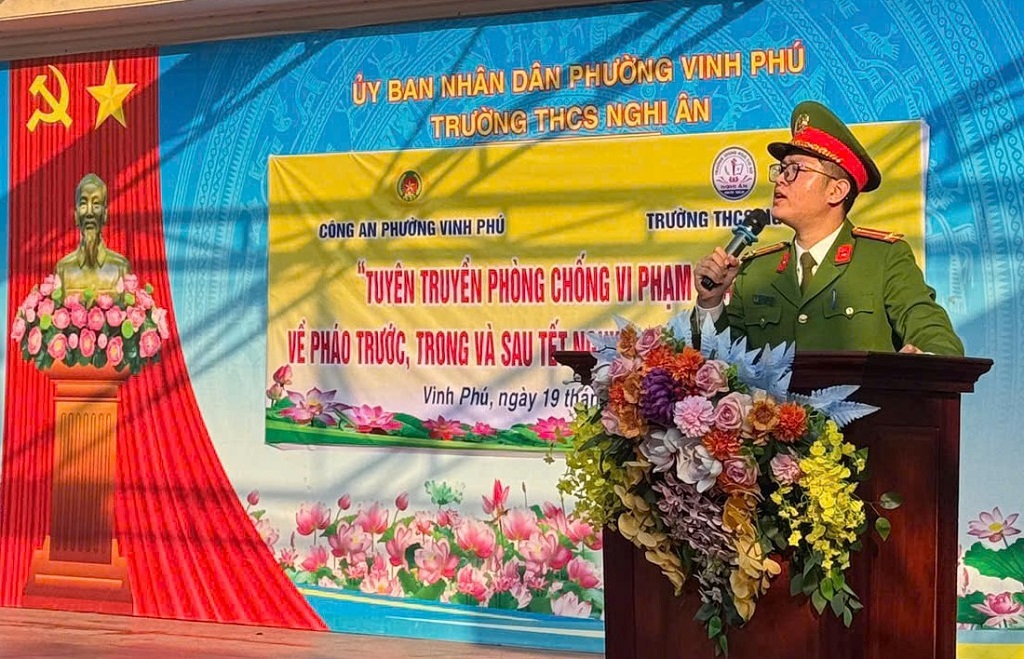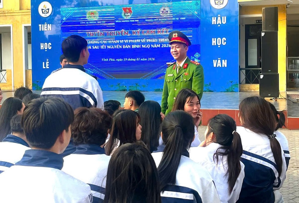 (Congan.nghean.gov.vn)-Nhằm đảm bảo ANTT, giữ gìn bình yên cho Nhân dân vui Xuân, đón Tết an toàn, lành mạnh, trong những ngày qua, Công an phường Vinh Phú đồng loạt ra quân triển khai cao điểm tuyên truyền tại Trường THCS và THPT về phòng, chống hành vi vi phạm pháp luật về pháo trước, trong và sau Tết Nguyên đán Bính Ngọ 2026.