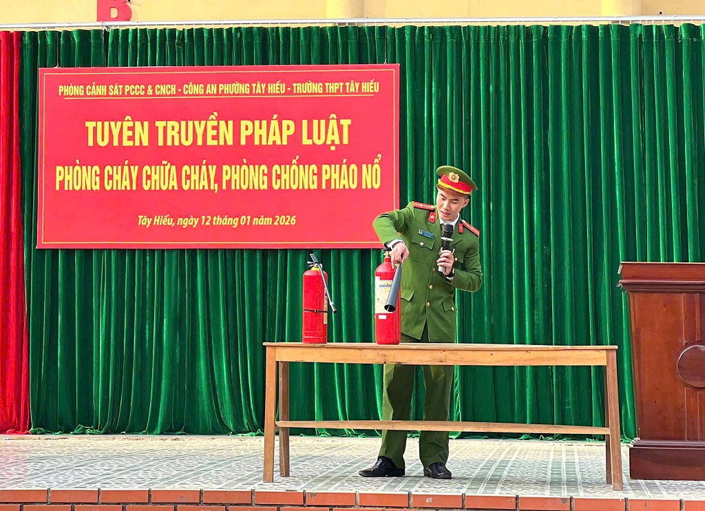 (Congan.nghean.gov.vn)-Nhằm nâng cao nhận thức, ý thức chấp hành pháp luật cho học sinh trong dịp trước, trong và sau Tết Nguyên đán Bính Ngọ 2026, sáng 12/01/2026, Phòng Cảnh sát phòng cháy, chữa cháy và cứu nạn, cứu hộ (PCCC&CNCH), Công an tỉnh Nghệ An và Công an phường Tây Hiếu phối hợp với Trường THPT Tây Hiếu tổ chức buổi tuyên truyền, phổ biến giáo dục pháp luật cho học sinh toàn trường.