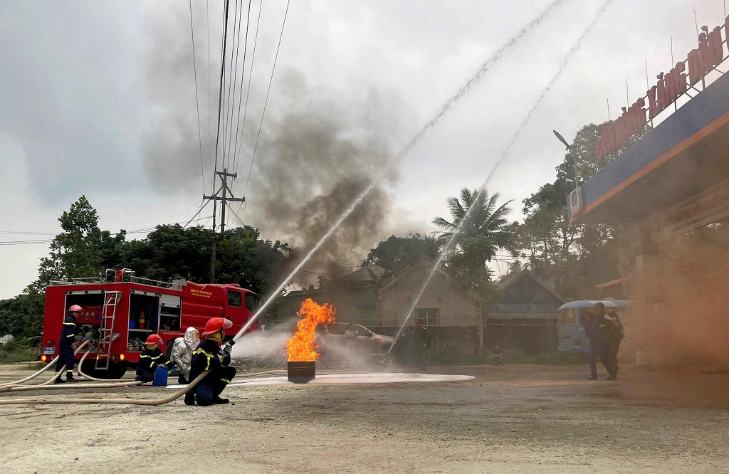 Tình huống giả định đặt ra là xảy ra cháy tại khu vực cột bơm xăng của cửa hàng. Ngay khi phát hiện sự cố, lực lượng PCCC cơ sở nhanh chóng triển khai biện pháp xử lý ban đầu, đồng thời báo tin cho lực lượng Cảnh sát PCCC&CNCH. Nhận tin báo, Đội CC&CNCH số 6 huy động lực lượng, phương tiện khẩn trương có mặt tại hiện trường, tổ chức trinh sát, triển khai đội hình chữa cháy và cứu nạn, cứu hộ.