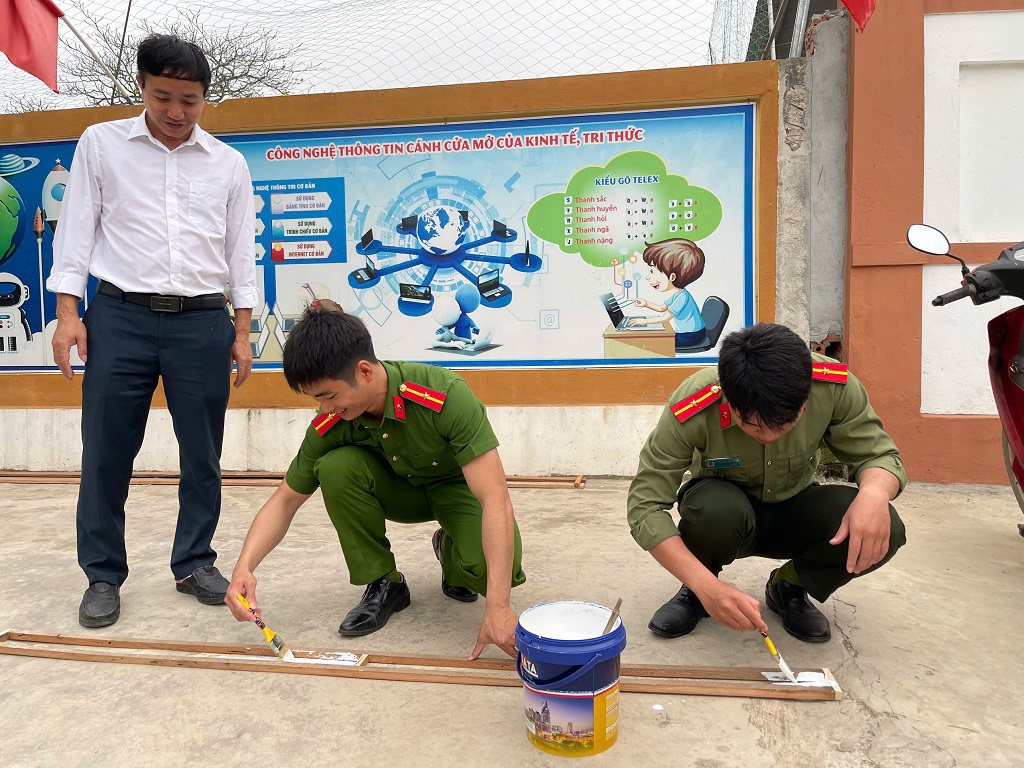 (Congan.nghean.gov.vn)-Hưởng ứng Tháng Thanh niên năm 2026, Tuổi trẻ Công an xã Vân Tụ tổ chức ra quân kẻ vạch để xe tại khu vực trước cổng trường học, nhằm sắp xếp phương tiện gọn gàng, khoa học.