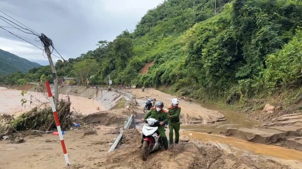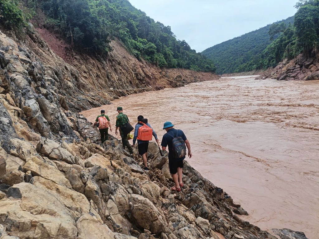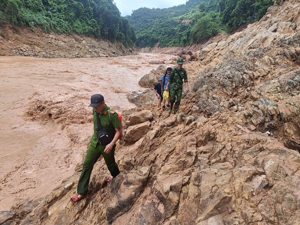 | Để đến được bản Cha Nga, lực lượng “4 tại chỗ” phải liều mình đi bộ men theo sườn núi và dọc vết đứt gãy của con đường hiện đang trong tình trạng sạt lở và tiếp tục có nguy cơ sạt lở cao.Sau 2 ngày đi bộ, các lực lượng tiếp cận được bản Cha Nga, hỗ trợ ban đầu cho bà con nơi đây. |