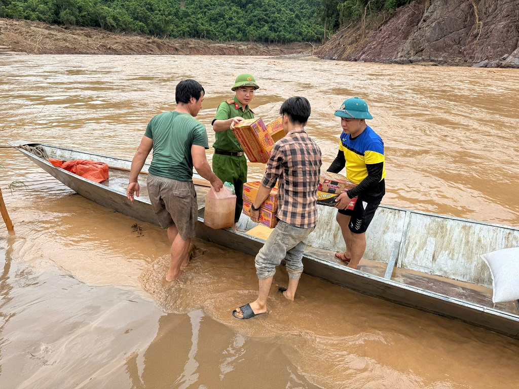 | Sử dụng thuyền bè để tiếp cận bản Yên Hòa, hỗ trợ nhu yếu phẩm cho bà con. |