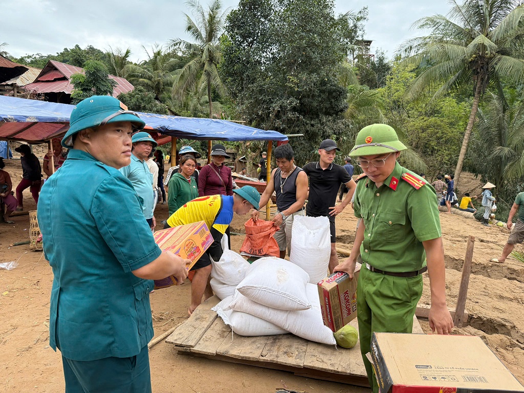 | Công an xã Mỹ Lý phối hợp với chính quyền địa phương phát tiền mặt và nhu yếu phẩm cho người dân bản Xiềng Tắm để bà con sớm ổn định cuộc sống. |