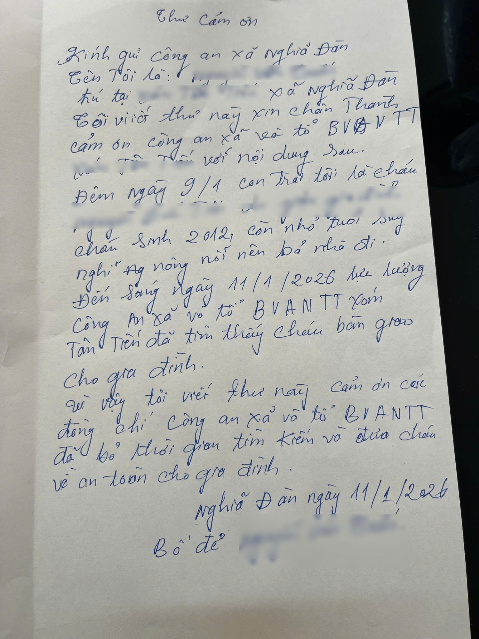 | Gia đình cháu T. viết thư cảm ơn Công an xã Nghĩa Đàn |
