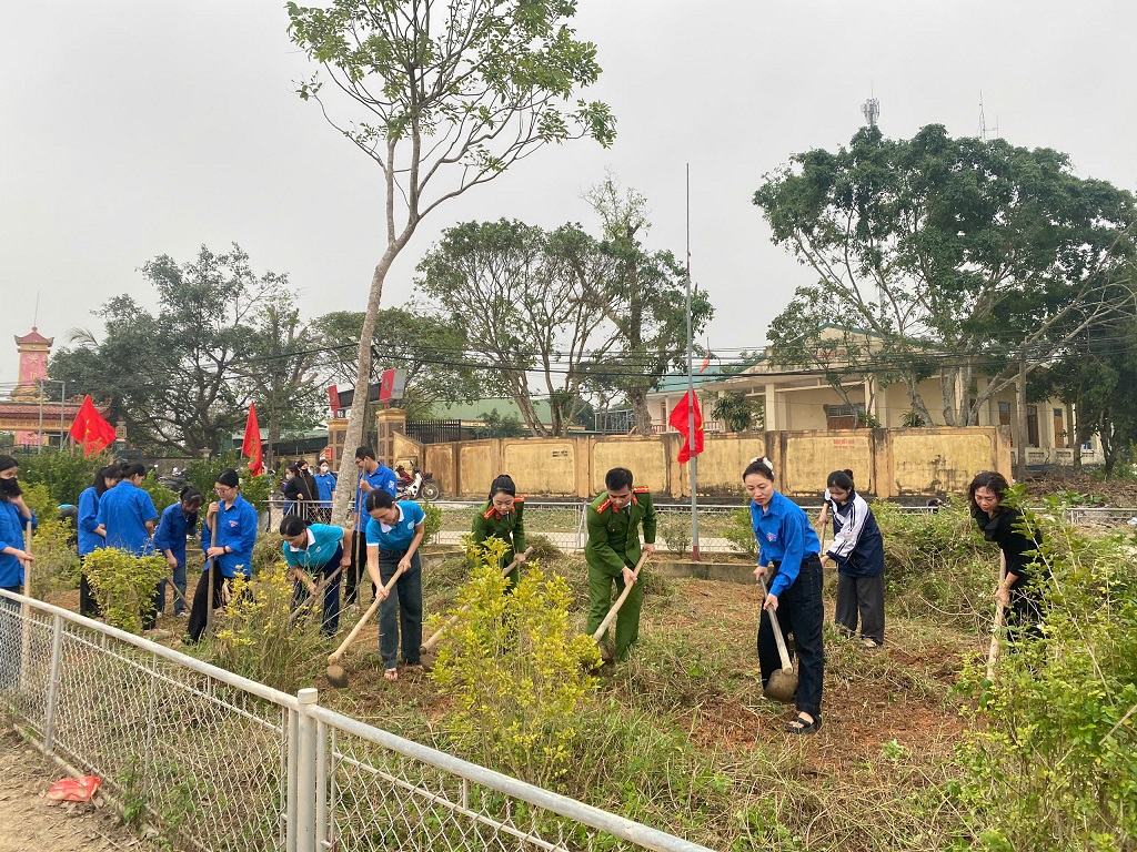 Tại buổi ra quân, Công an xã cùng tổ chức đoàn thể dọn dẹp vệ sinh, thu gom rác thải, phát quang bụi rậm và chăm sóc tuyến đường hoa, góp phần tạo diện mạo nông thôn mới xanh - sạch - đẹp.