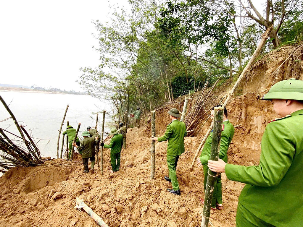 | Công an xã tham gia trồng tre khu vực ven bờ sông Lam |