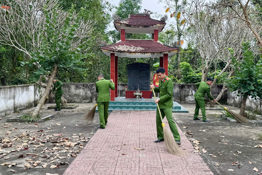 | Công an xã Cam Phục tổ chức dọn dẹp vệ sinh và thắp hương tri ân tại Nghĩa trang liệt sỹ. |