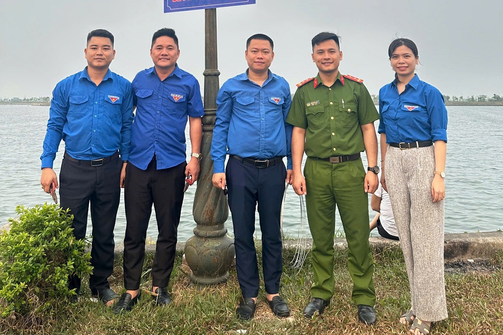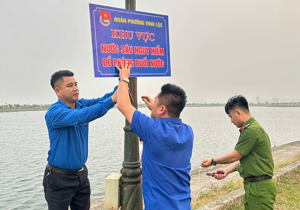 Chi đoàn Công an phường Vinh Lộc cắm biển cảnh báo tại hồ điều hòa