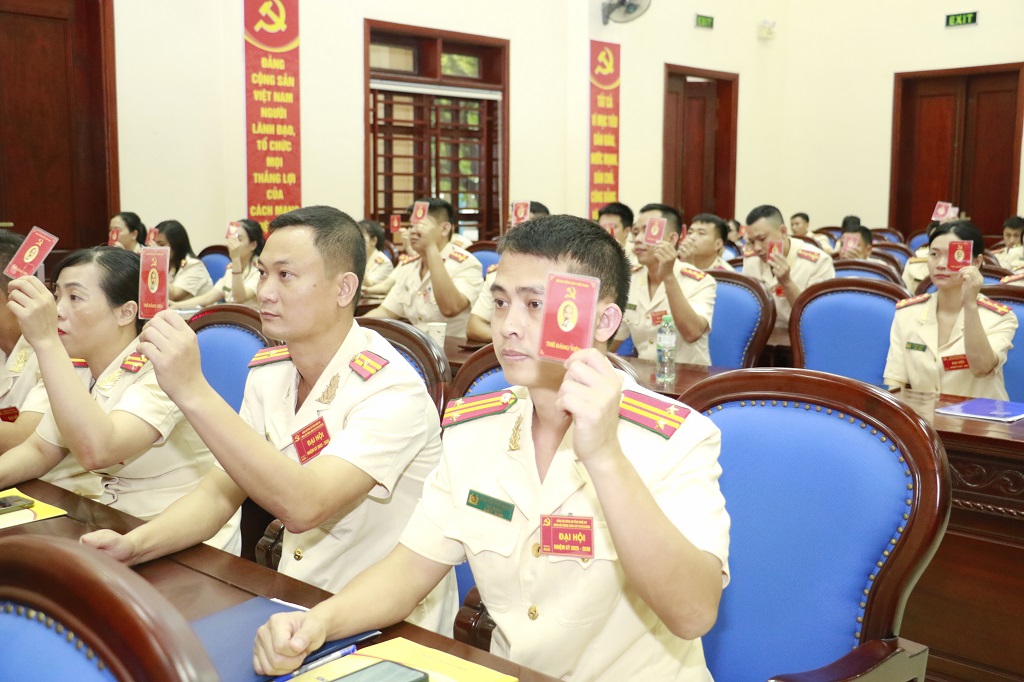 | Các đảng viên trong Đảng bộ biểu quyết, thống nhất thông qua văn kiện Đại hội Đảng cấp trên |