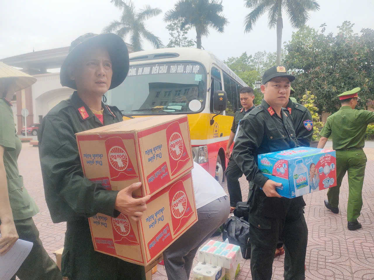 Để kịp thời tăng cường lực lượng hỗ trợ Công an các xã miền núi giúp đỡ Nhân dân ứng phó, khắc phục hậu quả mưa lũ, lãnh đạo Công an tỉnh huy động 240 cán bộ chiến sĩ thuộc Tiểu Đoàn 1, Trung đoàn Cảnh sát Cơ động dự bị chiến đấu đang tham gia huấn luyện tăng cường cho 08 xã Nhôn Mai, Lượng Minh, Hữu Kiệm, Mường Xén, Con Cuông, Chiêu Lưu, Tam Thái, Thành Bình Thọ. Đồng thời Giám đốc Công an tỉnh, các Phó Giám đốc Công an tỉnh cùng Lãnh đạo các phòng Công an tỉnh trực tiếp xuống, bám địa bàn cơ sở để chỉ đạo và tổ chức hỗ trợ Nhân dân. Các phòng Công an tỉnh, Công an các xã, phường vùng không bị thiệt hại thực hiện chế độ sẵn sàng về quân số để điều động khi có yêu cầu. Về mặt hậu cần đảm bảo, Công an tỉnh đã chuẩn bị các nhu yếu phẩm thiết yếu (nước uống, mì tôm, lượng khô...) để phục vụ các lực lượng tham gia phòng, chống, khắc phục hậu quả mưa lũ và hỗ trợ, trao tặng cho bà con Nhân dân vùng bị ảnh hưởng mưa lũ.