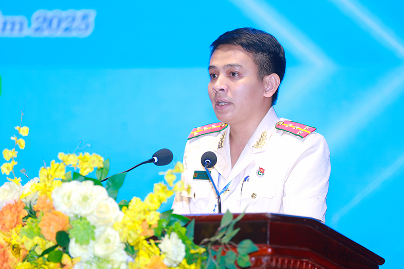 | Đồng chí Thiếu tá Nguyễn Sỹ Nguyên, Phó Trưởng Ban Thanh niên Công an tỉnh trình bày tóm tắt báo cáo chính trị nhiệm kỳ 2022-2025 |