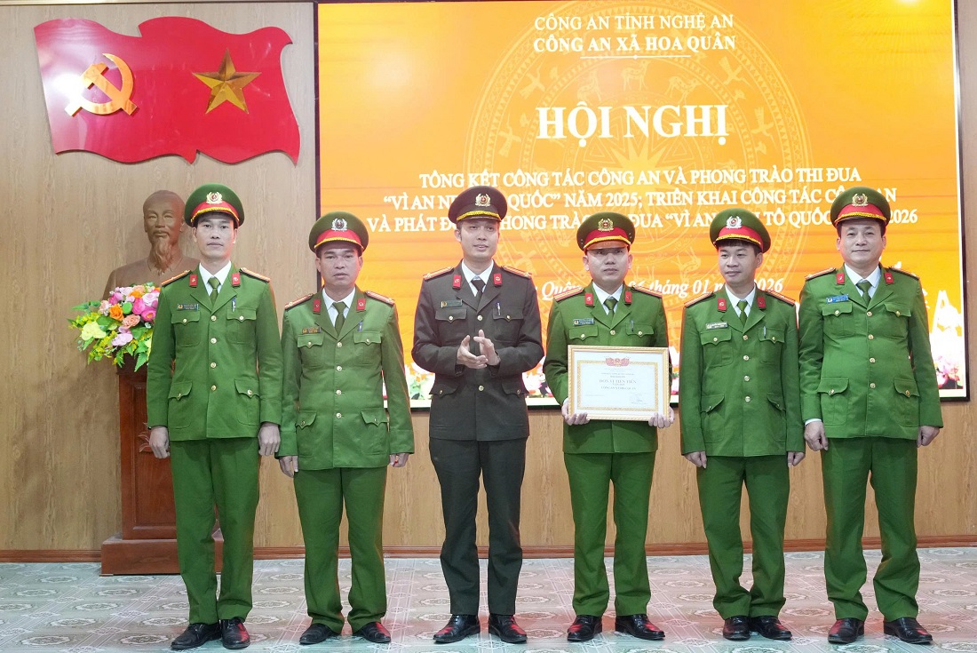 (Congan.nghean.gov.vn)-Chiều 06/01, Công an xã Hoa Quân tổ chức Hội nghị triển khai công tác năm 2026. Tham dự Hội nghị có đại diện lãnh đạo một số phòng Công an tỉnh; Lãnh đạo Đảng ủy, UBND, phòng, ban trực thuộc xã Hoa Quân.