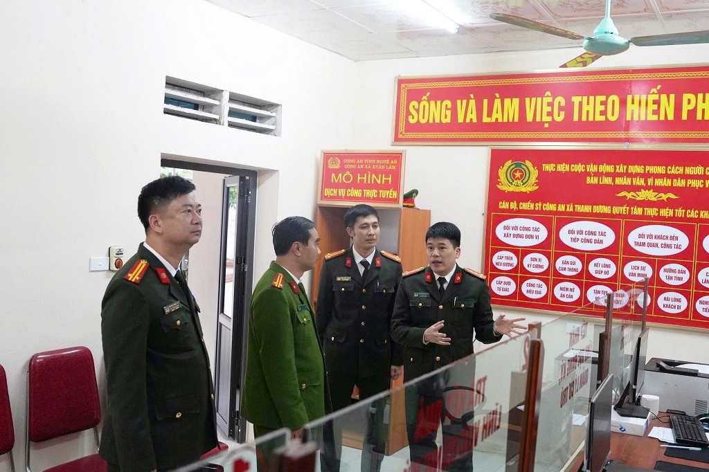 | Đồng chí Đại tá Trần Hồng Quang, Phó Bí thư Đảng ủy, Phó Giám đốc Công an tỉnh tham quan Bộ phận một cửa Công an xã Xuân Lâm |
