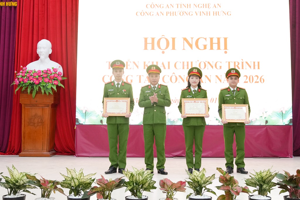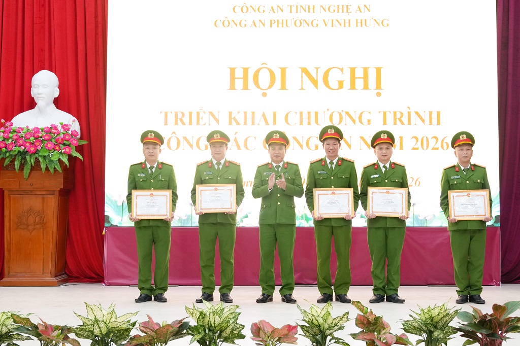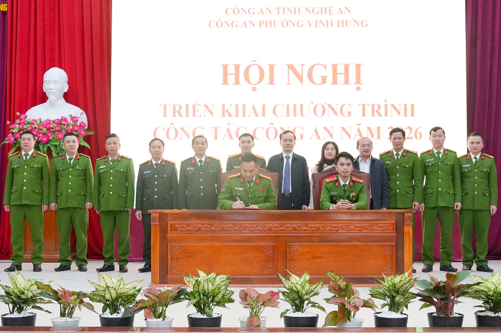 (Congan.nghean.gov.vn)-Đó là phát biểu chỉ đạo của đồng chí Đại tá Nguyễn Duy Thanh, Ủy viên Ban Thường vụ Đảng ủy, Phó Giám đốc Công an tỉnh và đồng chí Chu Hữu Bằng, Bí thư Đảng ủy, Chủ tịch HĐND phường tại Hội nghị triển khai chương trình công tác công an năm 2026 của Công an phường Vinh Hưng vào chiều 08/01/2026.