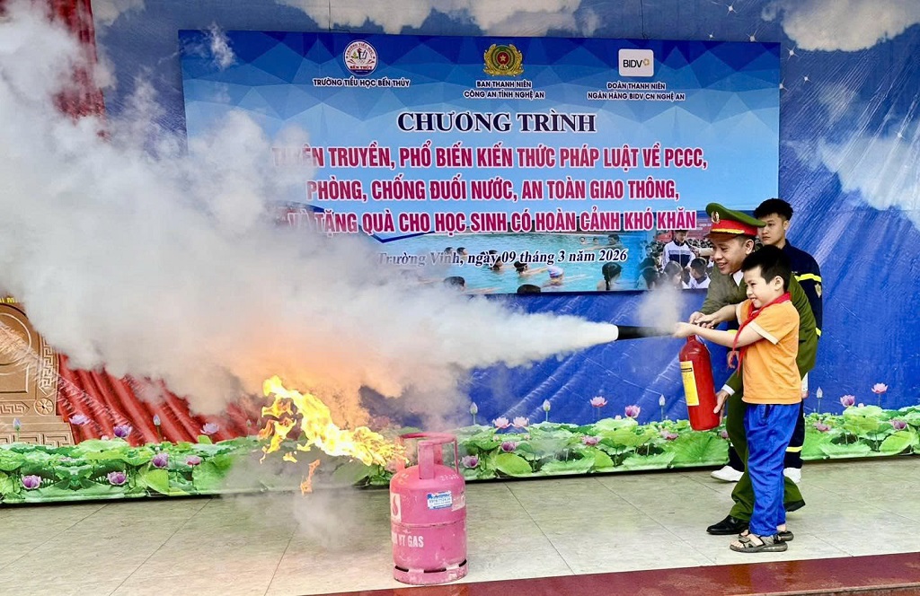 Tiếp đó, sáng 09/3/2026, Ban Thanh niên Công an tỉnh Nghệ An phối hợp với Ngân hàng BIDV Nghệ An và Trường Tiểu học Bến Thủy tổ chức chương trình tuyên truyền, phổ biến, giáo dục pháp luật kết hợp trao học bổng tặng học sinh có hoàn cảnh khó khăn. Chương trình thu hút hơn 800 học sinh và giáo viên nhà trường tham gia. Tại đây, Đoàn cơ sở Phòng Cảnh sát PCCC&CNCH đã trực tiếp tuyên truyền, phổ biến kiến thức pháp luật về phòng cháy, chữa cháy và cứu nạn, cứu hộ; hướng dẫn kỹ năng xử lý khi xảy ra cháy, kỹ năng thoát nạn an toàn; đồng thời lồng ghép trang bị kiến thức phòng, chống tai nạn đuối nước cho các em học sinh.