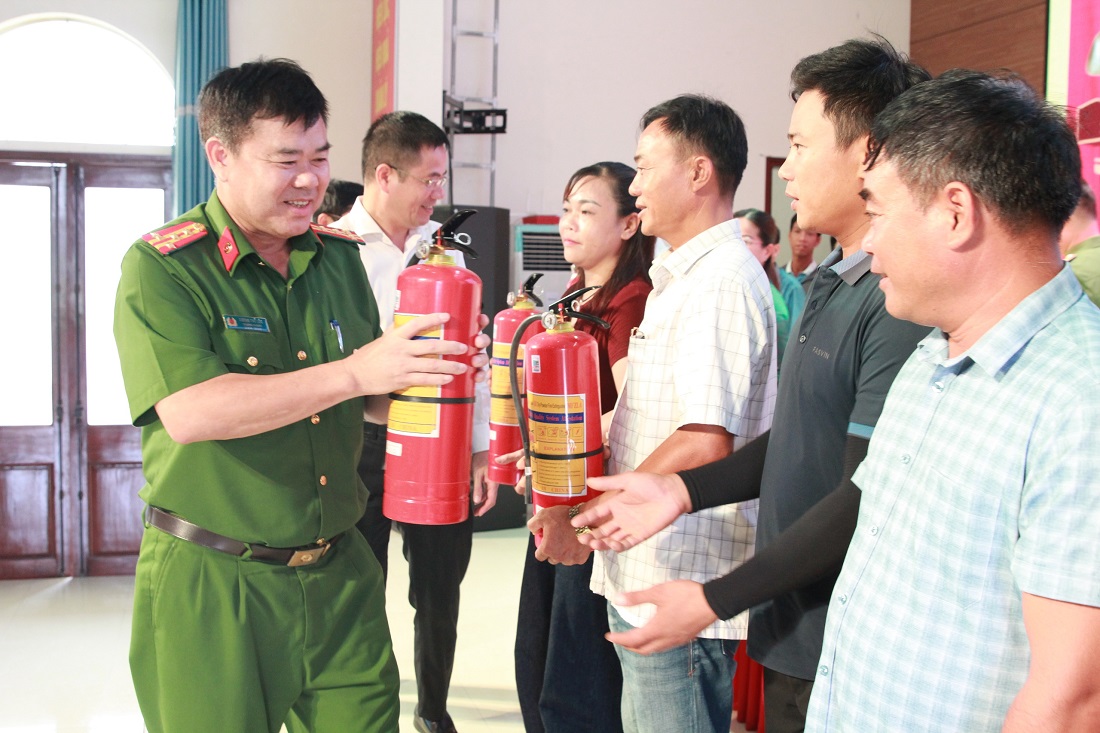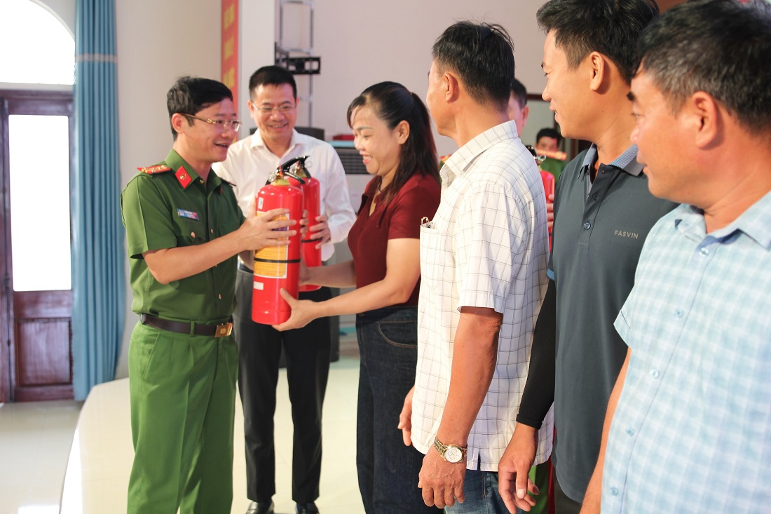 | Các đồng chí Lãnh đạo Công an tỉnh, Phòng Cảnh sát QLHC về TTXH và cấp ủy, chính quyền địa phương trao bình chữa cháy tặng người dân giao nộp VK, VLN, CCHT và pháo |