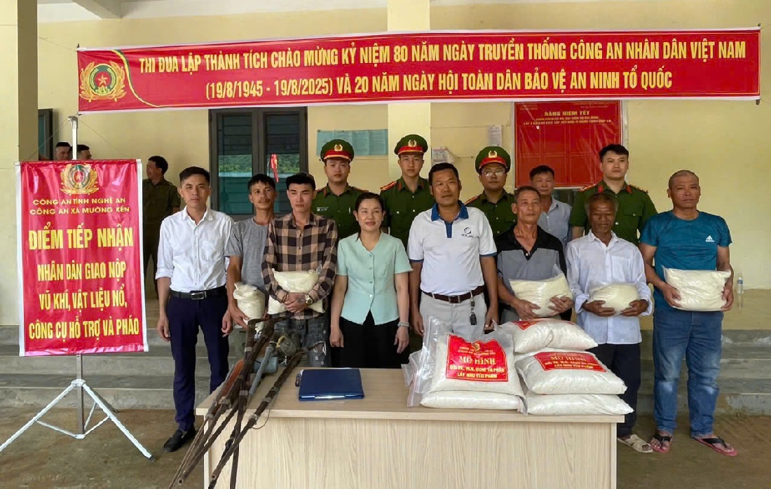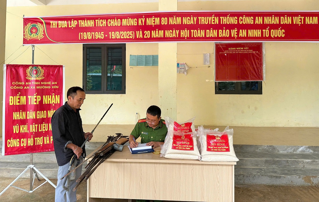Trong khuôn khổ chương trình, tại bản Sơn Thành, Công an xã Mường Xén tổ chức điểm thu nhận vũ khí, vật liệu nổ, công cụ hỗ trợ với khẩu hiệu “Đổi vũ khí, vật liệu nổ, công cụ hỗ trợ lấy nhu yếu phẩm”. Hoạt động đã được Nhân dân nhiệt tình hưởng ứng, kết quả thu nhận 10 khẩu súng các loại. Tại điểm thu nhận, Công an xã cũng tổ chức cho Nhân dân ký cam kết không sản xuất, mua bán, vận chuyển, tàng trữ, sử dụng vũ khí, vật liệu nổ, công cụ hỗ trợ, pháo nổ và các hành vi vi phạm pháp luật khác. Kết quả, hơn 50 hộ gia đình đã tham gia ký kết.
