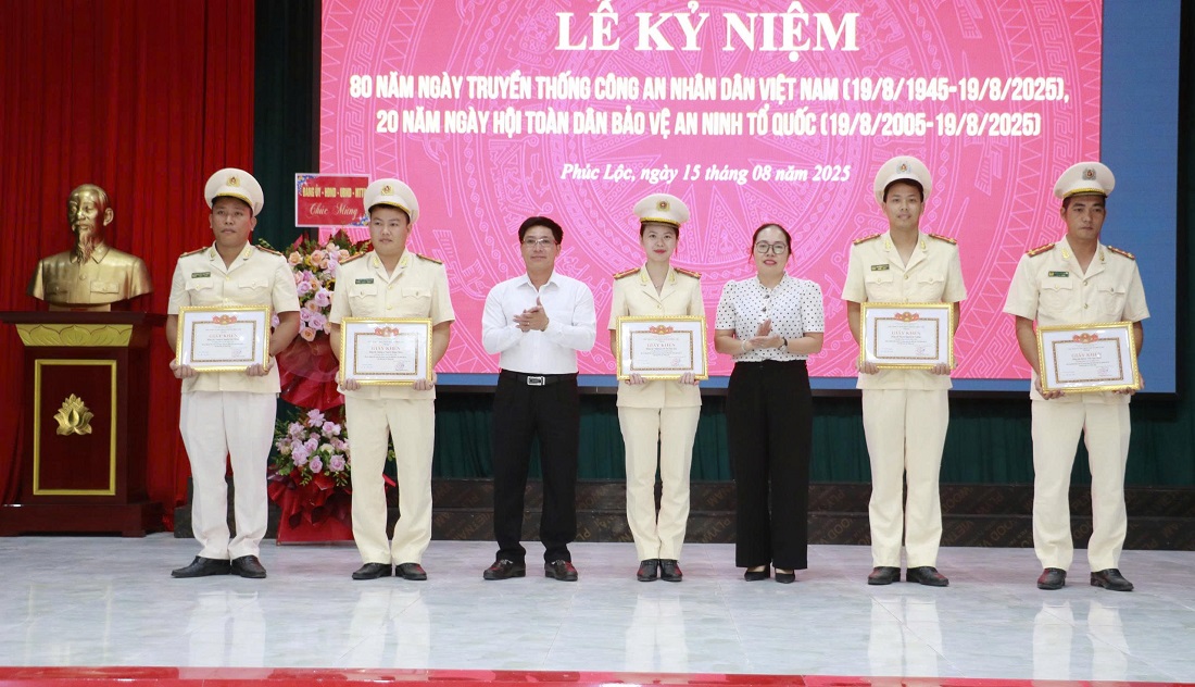 (Congan.nghean.gov.vn)-Chiều 15/8/2025, xã Phúc Lộc tổ chức trọng thể Lễ kỷ niệm 80 năm Ngày truyền thống Công an Nhân dân Việt Nam (19/8/1945 - 19/8/2025) và 20 năm Ngày hội Toàn dân bảo vệ an ninh Tổ quốc (19/8/2005 - 19/8/2025). Dự lễ kỷ niệm có các đồng chí: Nguyễn Ngọc Biên, Bí thư Đảng ủy, Chủ tịch HĐND xã; Đồng Bính Định, Phó Bí thư thường trực Đảng ủy xã; Trương Thị Thanh Huyền, Chủ tịch UBND xã Phúc Lộc.