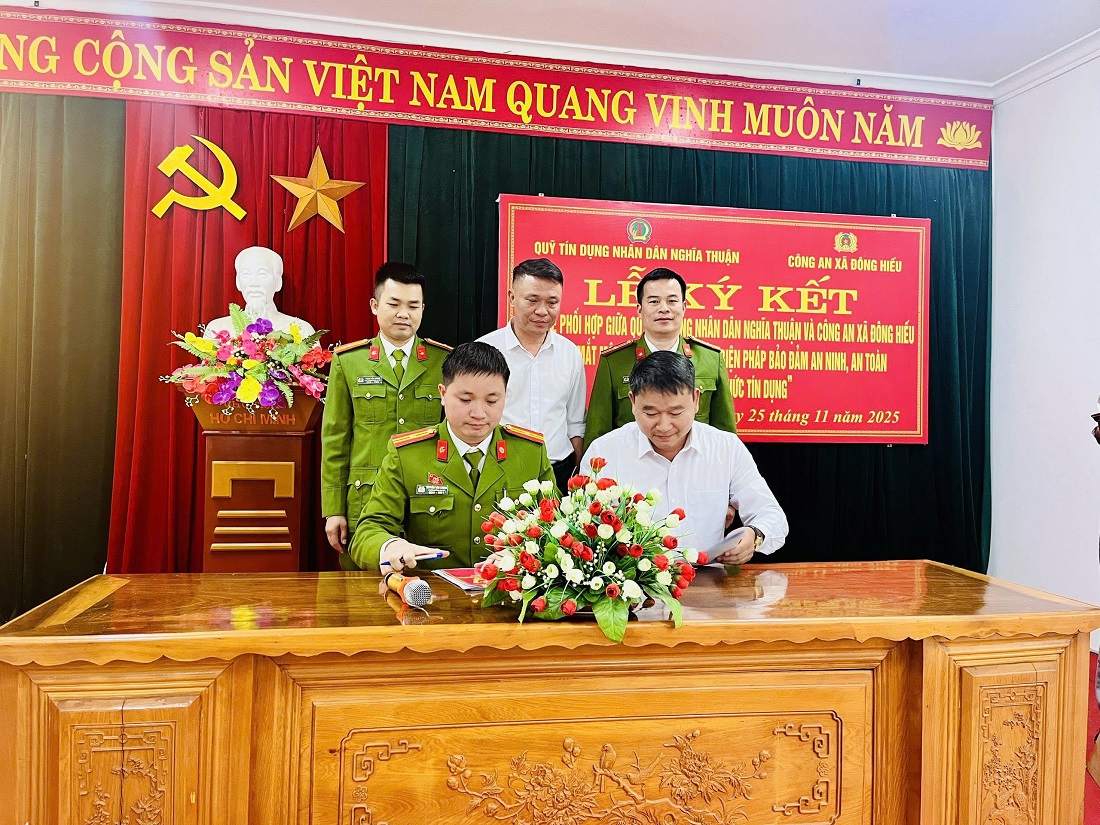 (Congan.nghean.gov.vn)-Nhằm tăng cường công tác phối hợp trong bảo đảm an ninh, an toàn hoạt động tín dụng, chiều 25/11, Quỹ Tín dụng nhân dân Nghĩa Thuận và Công an xã Đông Hiếu tổ chức Lễ ký kết Quy chế phối hợp giữa hai đơn vị và ra mắt mô hình “Triển khai các biện pháp bảo đảm an ninh, an toàn trong các tổ chức tín dụng”.