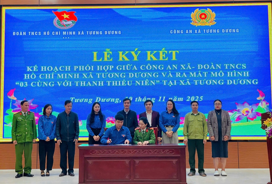 (Congan.nghean.gov.vn)-Công an xã Tương Dương và Đoàn Thanh niên xã vừa phối hợp tổ chức Lễ ký kết kế hoạch phối hợp giữa hai đơn vị và ra mắt mô hình “03 cùng với thanh, thiếu niên”.