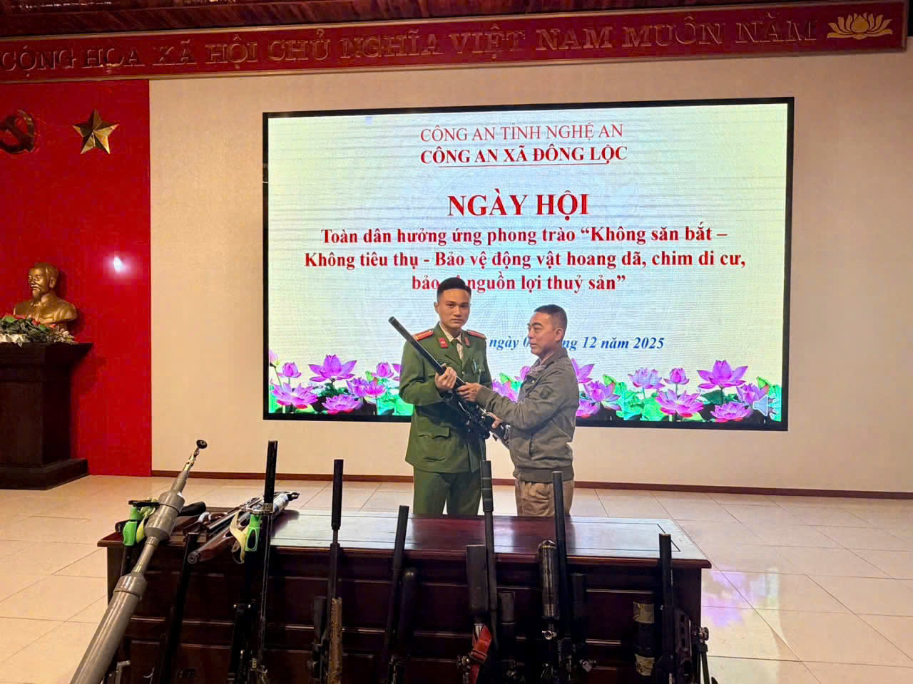 Chiều 05/12/2025, Công an xã Đông Lộc tổ chức “Ngày hội toàn dân bảo vệ động vật hoang dã, nguồn lợi thủy sản và giao nộp công cụ bẫy săn bắt chim trời”. Tại ngày hội, Công an xã phổ biến đến người dân quy định của pháp luật về: Bảo vệ động vật hoang dã, chim trời; Những hành vi bị nghiêm cấm theo Luật Lâm nghiệp, Luật Thủy sản; Tác hại của việc đặt bẫy, sử dụng xung điện, chất nổ, chất độc để khai thác thủy sản…