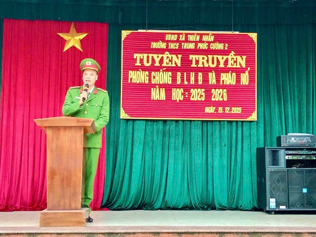 (Congan.nghean.gov.vn)-Thực hiện đợt cao điểm tấn công, trấn áp tội phạm, ngày 15/12/2025, Công an xã Thiên Nhẫn phối hợp Ban Giám hiệu Trường THCS Trung Phúc Cường 2 tổ chức tuyên truyền, phổ biến pháp luật về phòng, chống bạo lực học đường, vi phạm về pháo trước, trong và sau Tết Nguyên đán.