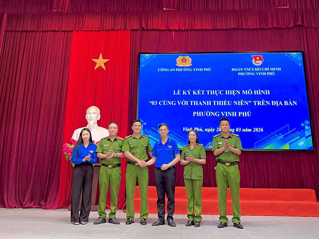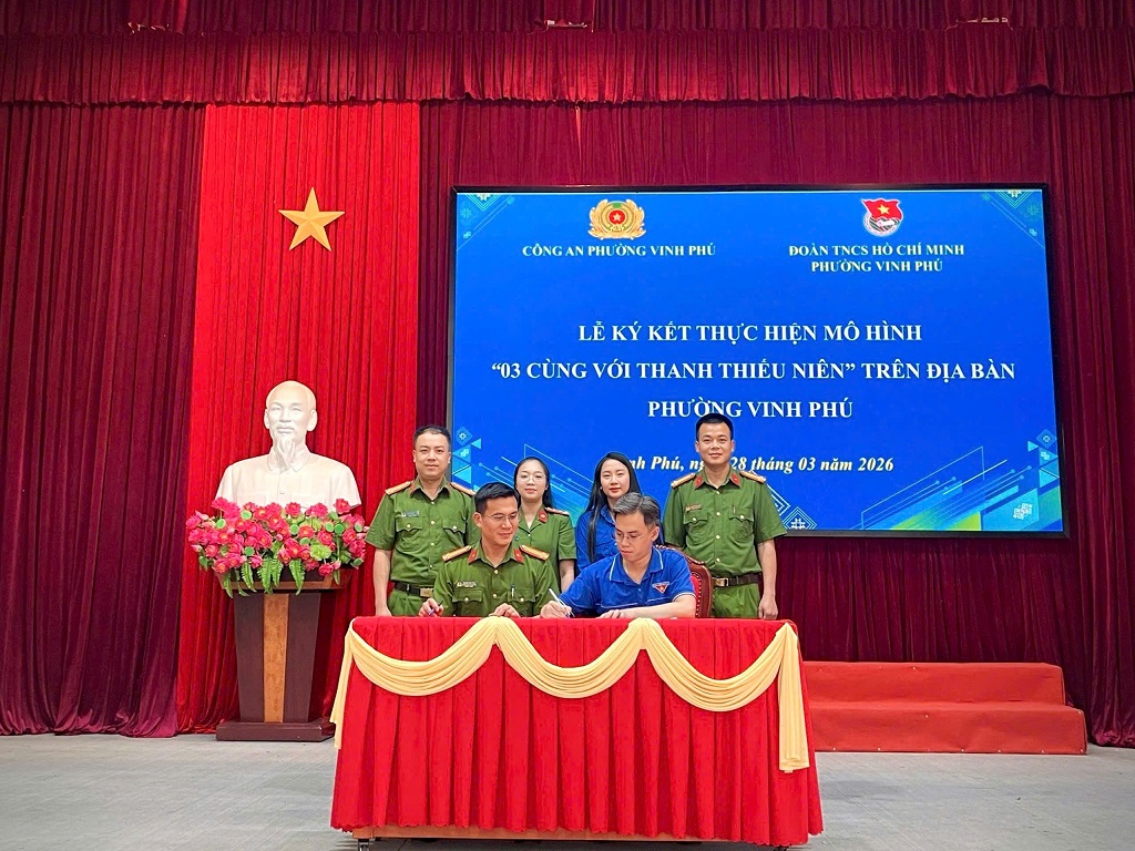 (Congan.nghean.gov.vn)-Nhằm tăng cường phối hợp, phát huy vai trò xung kích của tuổi trẻ trong bảo đảm an ninh trật tự, xây dựng phong trào toàn dân bảo vệ ANTQ, ngày 28/3/2026, Công an phường Vinh Phú phối hợp Đoàn Thanh niên phường tổ chức Lễ ký kết triển khai mô hình “03 cùng với thanh, thiếu niên”.
