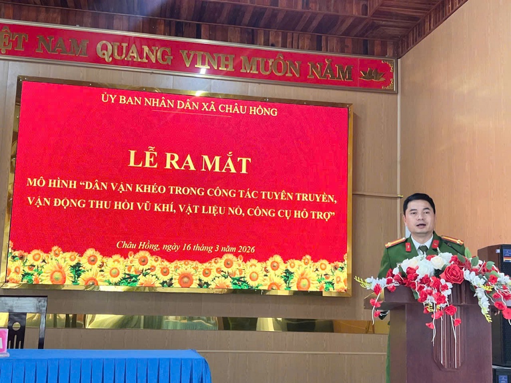 (Congan.nghean.gov.vn)-Chiều 16/03/2026, tại Hội trường Công an xã Châu Hồng đã tổ chức lễ ra mắt mô hình “Dân vận khéo trong công tác tuyên truyền, vận động thu hồi vũ khí, vật liệu nổ, công cụ hỗ trợ”.