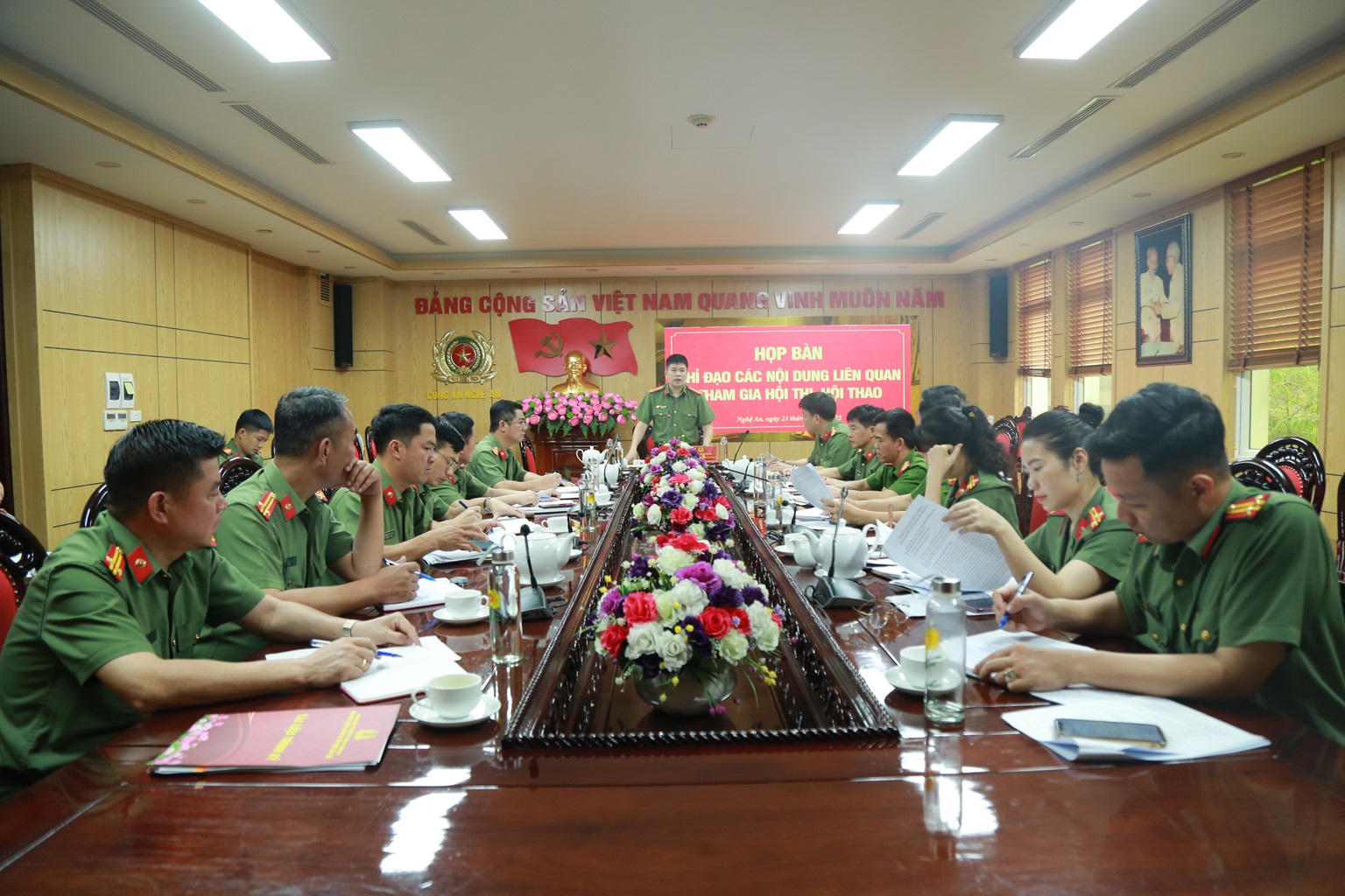 (Congan.nghean.gov.vn)-Sáng 23/4/2025 Công an tỉnh Nghệ An tổ chức Hội nghị rà soát công tác chuẩn bị các điều kiện để tham gia các nội dung tại vòng chung kết của Hội thi Điều lệnh, quân sự, võ thuật CAND lần thứ VI và Đại hội khỏe “Vì an ninh Tổ quốc” lần thứ IX năm 2025 do Bộ Công an tổ chức tại thành phố Hà Nội. Đồng chí Đại tá Trần Hồng Quang, Phó Bí thư Đảng ủy, Phó Giám đốc Công an tỉnh chủ trì Hội nghị.
