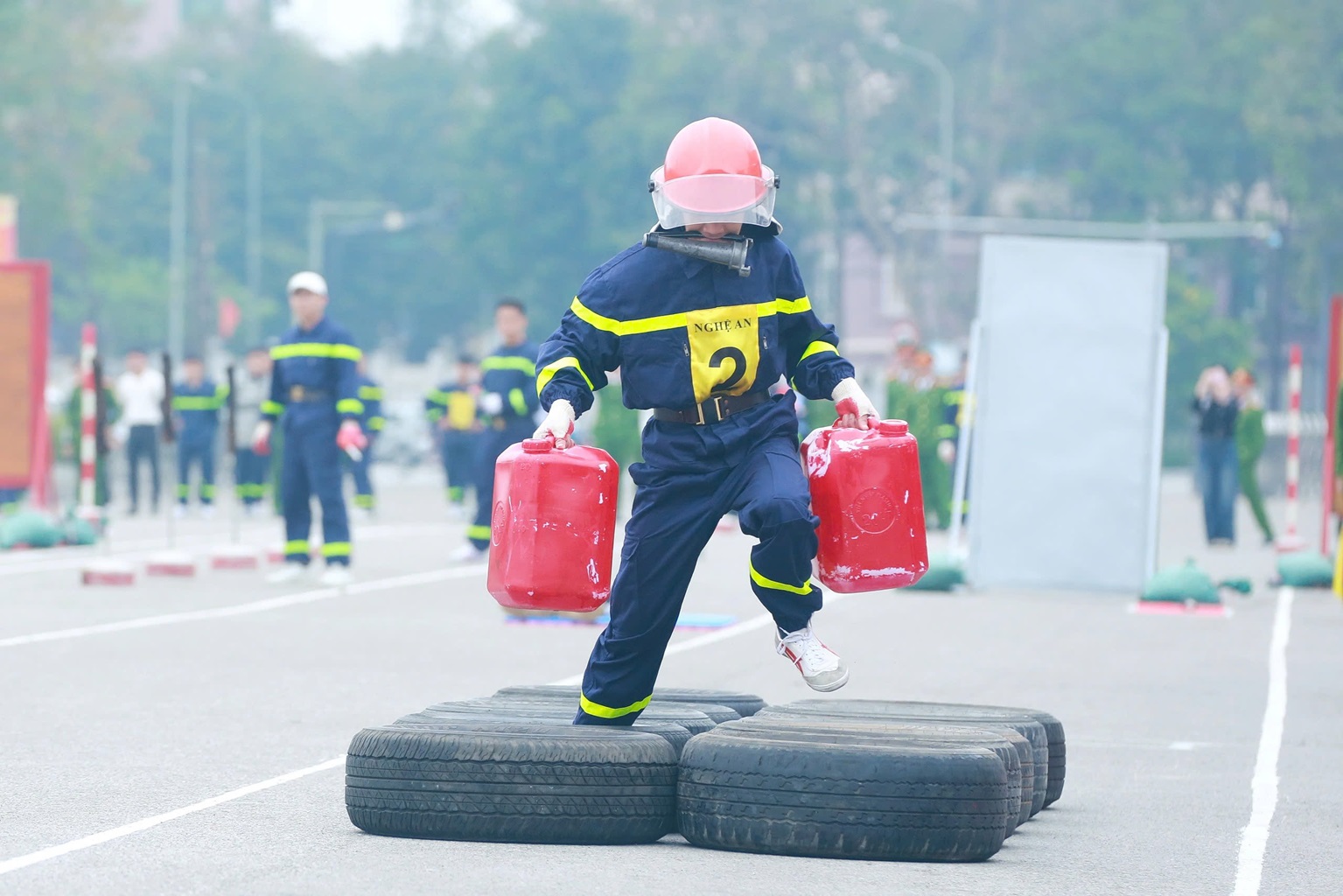 | Cán bộ, chiến sỹ Công an Nghệ An tham gia phần thi chạy tiếp sức cứu người và chữa cháy tại Hội thi thể thao nghiệp vụ chữa cháy và CNCH năm 2025 khu vực III |