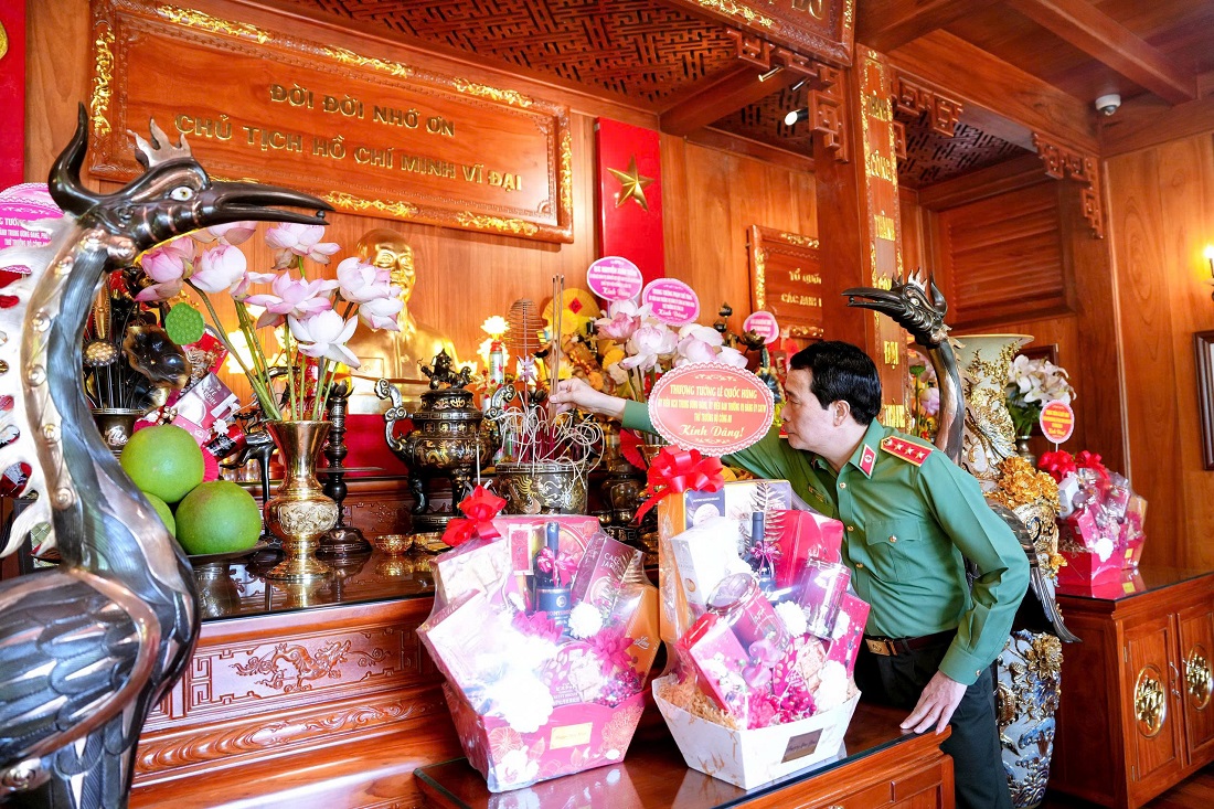 | Đồng chí Thượng tướng Lê Quốc Hùng, Ủy viên Trung ương Đảng, Ủy viên Ban Thường vụ Đảng ủy Công an Trung ương, Thứ trưởng Bộ Công an cùng Đoàn công tác Ban Thường vụ Đảng ủy Công an Trung ương và Đoàn công tác Ban Thường vụ Tỉnh ủy Nghệ An dâng hương lên anh linh Chủ tịch Hồ Chí Minh tại Nhà tưởng niệm của Người trong khuôn viên Công an tỉnh |