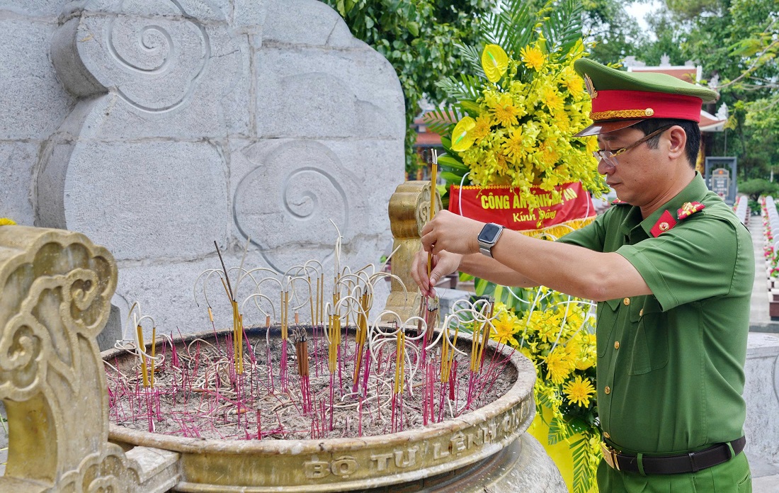 | Đồng chí Đại tá Trần Ngọc Tuấn, Ủy viên Ban Thường vụ Đảng ủy, Phó Giám đốc Công an tỉnh cùng Đoàn đại biểu dâng hương tại Nghĩa trang Liệt sĩ Đường 9 |