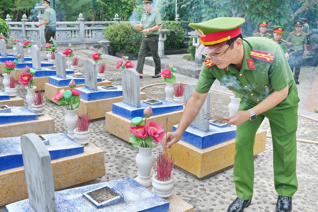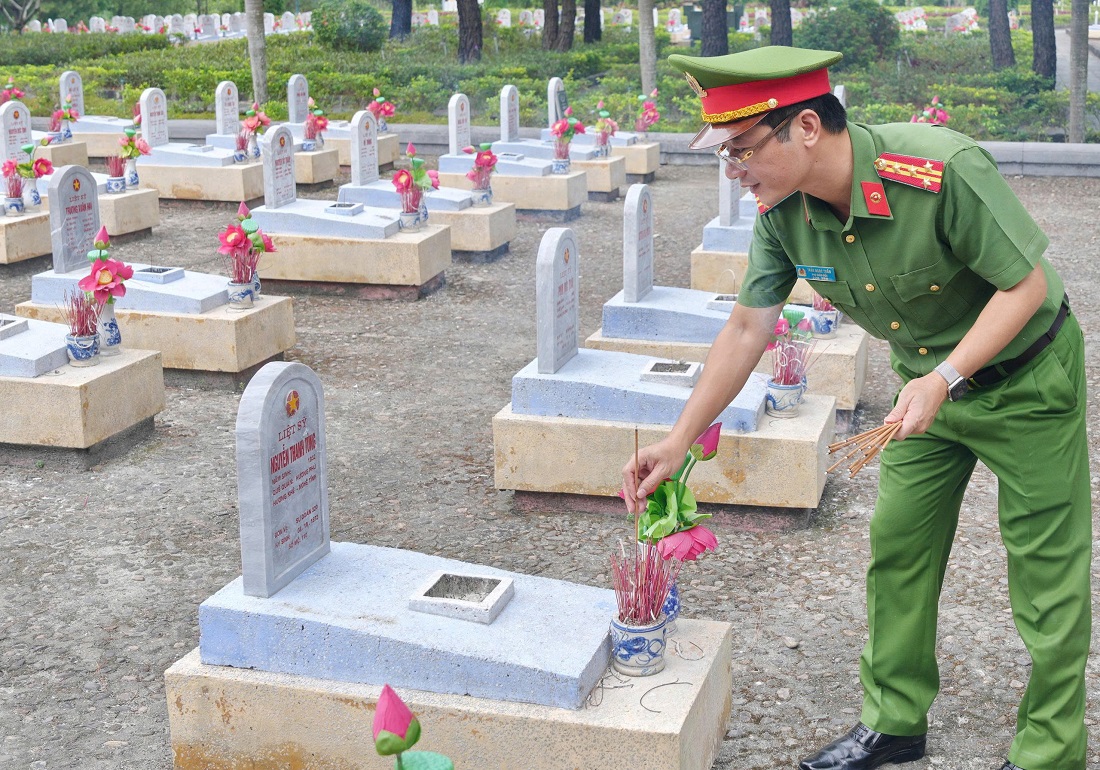 | Đồng chí Đại tá Trần Ngọc Tuấn, Ủy viên Ban Thường vụ Đảng ủy, Phó Giám đốc Công an tỉnh thỉnh chuông tại Nghĩa trang Liệt sĩ đường 9 |