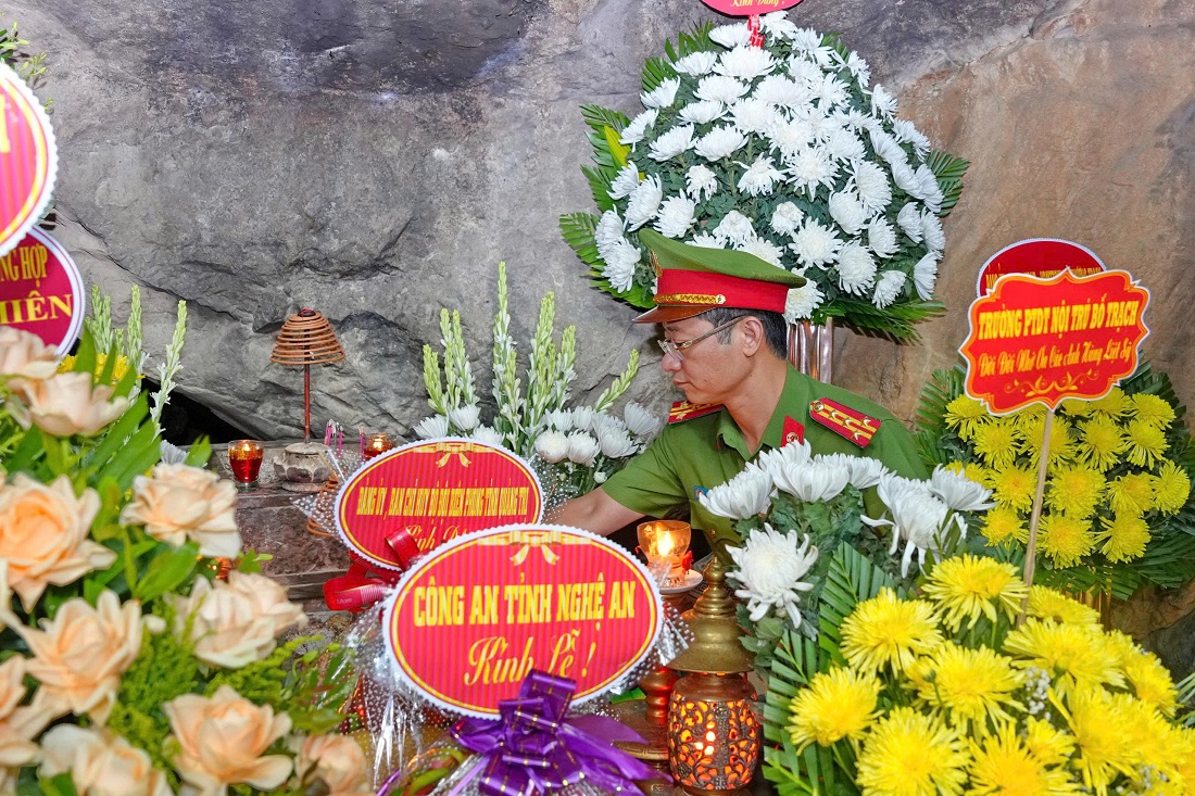 Đoàn đại biểu cũng đã đến dâng hoa, dâng hương tại Khu di tích Hang Tám Cô - nơi ghi dấu sự hy sinh anh dũng của các thanh niên xung phong trong cuộc kháng chiến chống Mỹ cứu nước. Trước anh linh của các liệt sĩ, Đoàn đã thắp nén tâm hương bày tỏ lòng biết ơn đối với những cống hiến thầm lặng, quả cảm của thế hệ đi trước. Sự hy sinh anh dũng của các anh, các chị là biểu tượng sáng ngời của tinh thần yêu nước, ý chí kiên cường và lý tưởng sống cao đẹp vì độc lập, tự do của dân tộc - một giá trị thiêng liêng tiếp tục được khơi dậy, hun đúc trong mỗi cán bộ, chiến sĩ Công an Nghệ An hôm nay.