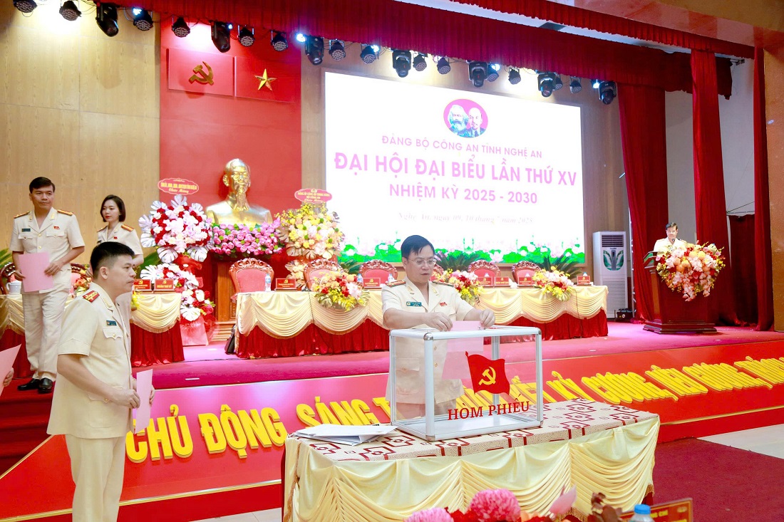 | Các đại biểu bỏ phiếu bầu Ban Chấp hành Đảng bộ Công an tỉnh Nghệ An khóa XV nhiệm kỳ 2025 - 2030 |