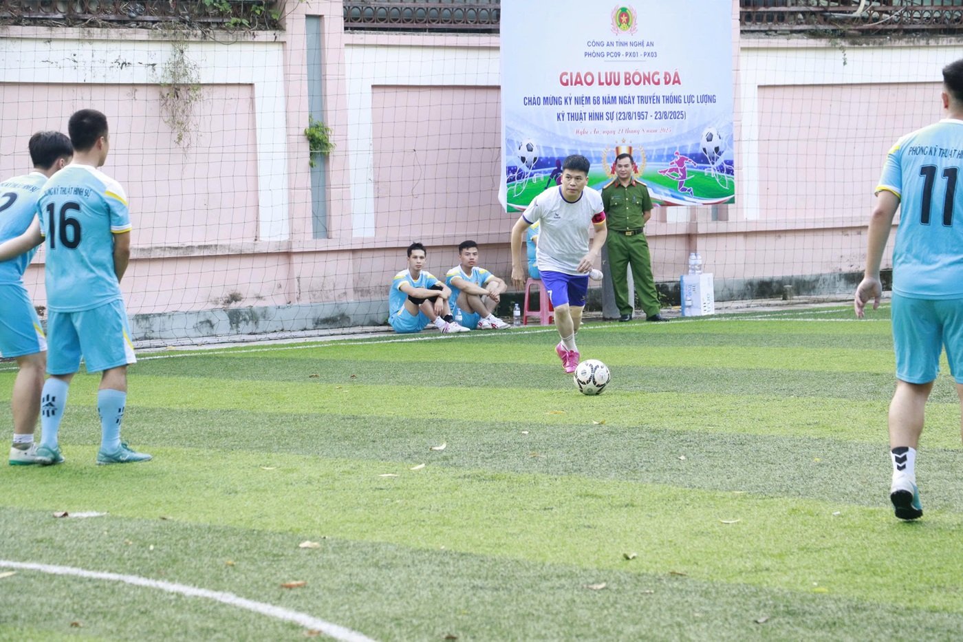 (Congan.nghean.gov.vn)-Thiết thực chào mừng kỷ niệm 80 năm Ngày truyền thống lực lượng Công an nhân dân Việt Nam (19/8/1945 – 19/8/2025), 68 năm Ngày truyền thống lực lượng kỹ thuật hình sự (23/8/1957 – 23/8/2025), chiều 21/8/2025, tại sân bóng đá Công an tỉnh diễn ra trận giao hữu bóng đá giữa 02 đội bóng của Phòng Kỹ thuật hình sự và liên quân Phòng Công tác chính trị và Phòng Tổ chức cán bộ Công an tỉnh Nghệ An.