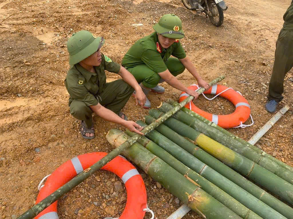 | Công an xã Yên Hoà làm bè mét và phao cứu sinh – phương tiện hỗ trợ di chuyển tạm thời – để phục vụ nhu cầu đi lại và vận chuyển nhu yếu phẩm cho người dân có nguy cơ bị cô lập |